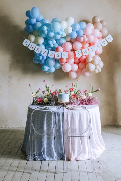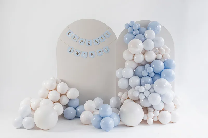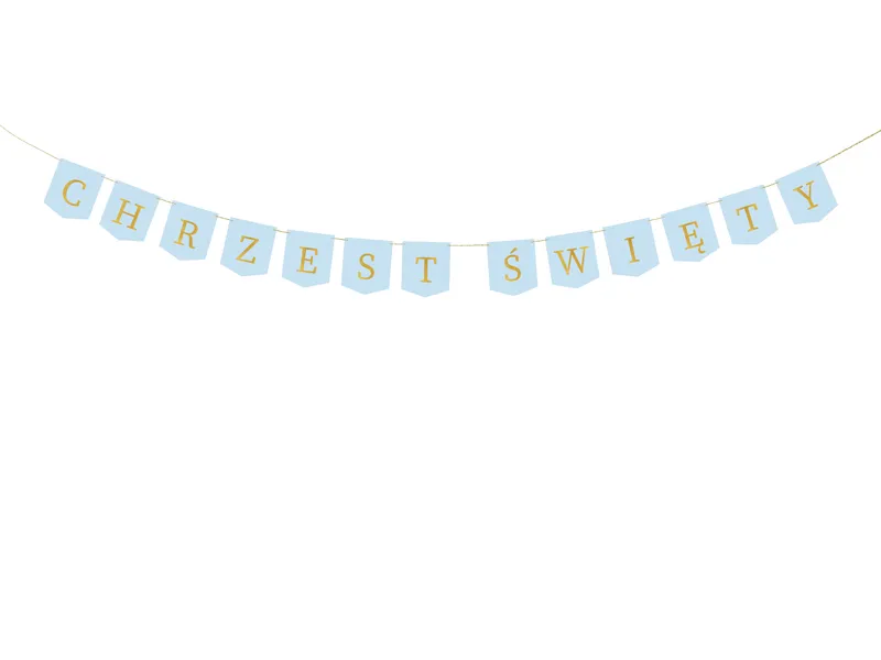 Stylowy i elegancki baner z napisem „Chrzest Święty” w odcieniach niebieskiego, ozdobiony połyskującymi złotymi literami. Doskonała dekoracja na uroczystość chrztu świętego chłopca – sprawdzi się zarówno w domu, jak i na sali przyjęć.
