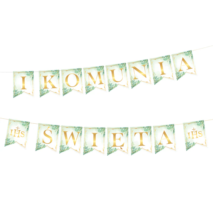 Dekoracyjny baner z napisem 'I Komunia Święta’, idealny na przyjęcie komunijne. Zestaw zawiera 16 flag o wymiarach 12 x 16 cm, tworzących girlandę o długości 240 cm. Stylowe zdobienie z motywem IHS i roślinnym wzorem w delikatnej zielono-złotej tonacji.