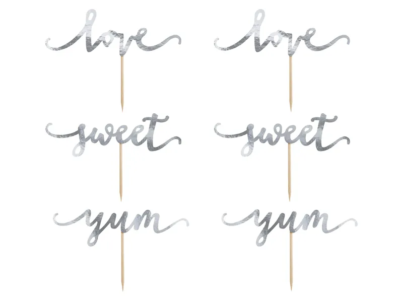 Eleganckie toppery na babeczki to doskonała dekoracja na każdą okazję. W zestawie znajduje się 6 ozdób wykonanych z lustrzanego srebrnego papieru z napisami „love”, „yum” i „sweet” napisanych stylową czcionką z ozdobnymi zawijasami.