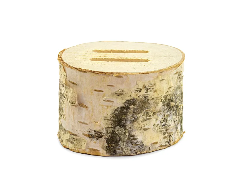 Drewniana podstawka z zagłębieniami na obrączki, idealna na wesele w stylu boho.