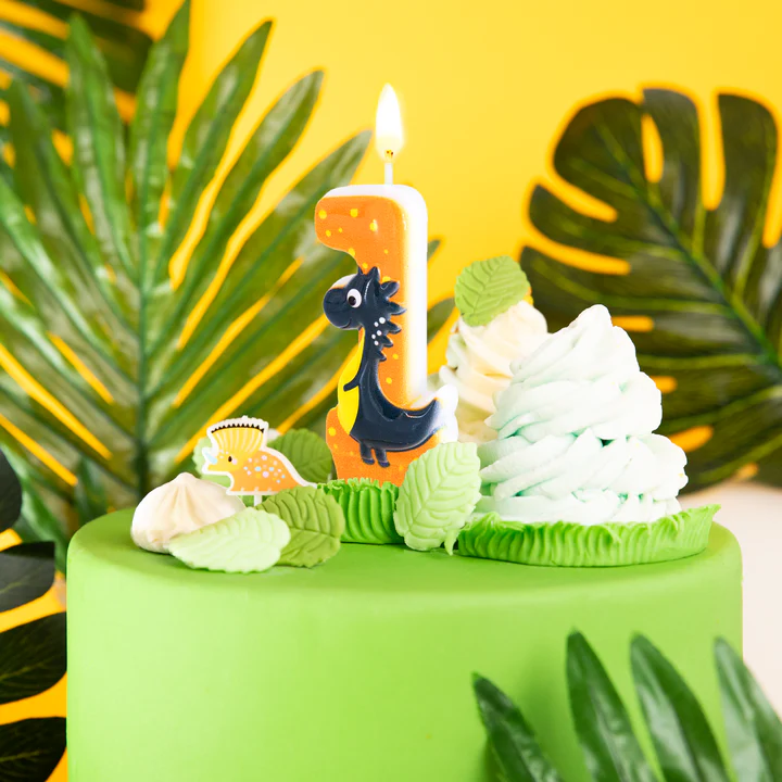 Urodzinowa świeczka w kształcie cyfry z postacią dinozaura – idealna na urodziny dla najmłodszych miłośników tych uroczych postaci.