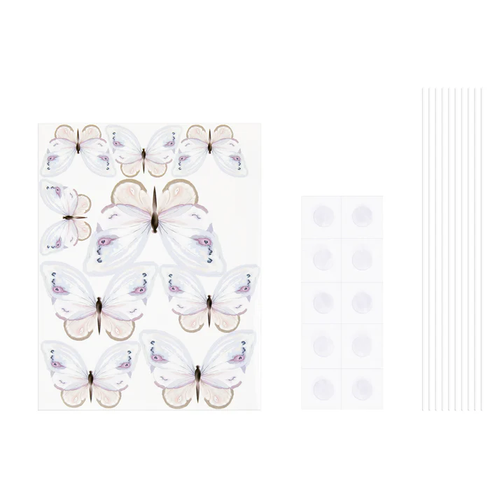 - W zestawie: 9 szt. papierowych motylków różnej wielkości, 9 szt. elastycznych pikerów, 10 szt. kropek klejowych