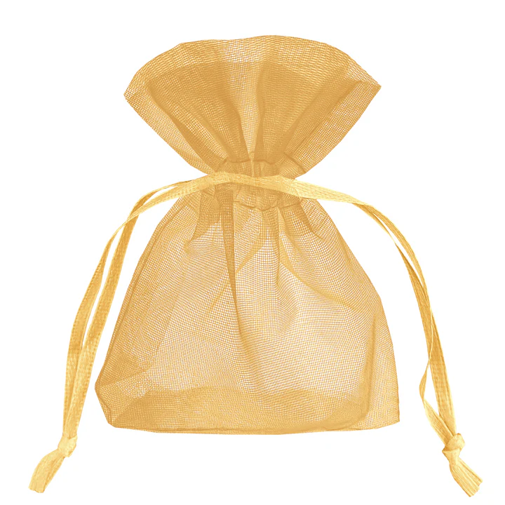 Zestaw 10 złotych woreczków z organzy o wymiarach 10 x 15 cm, idealnych na drobne prezenty, upominki lub dekoracje. Eleganckie i praktyczne – doskonałe na każdą okazję.