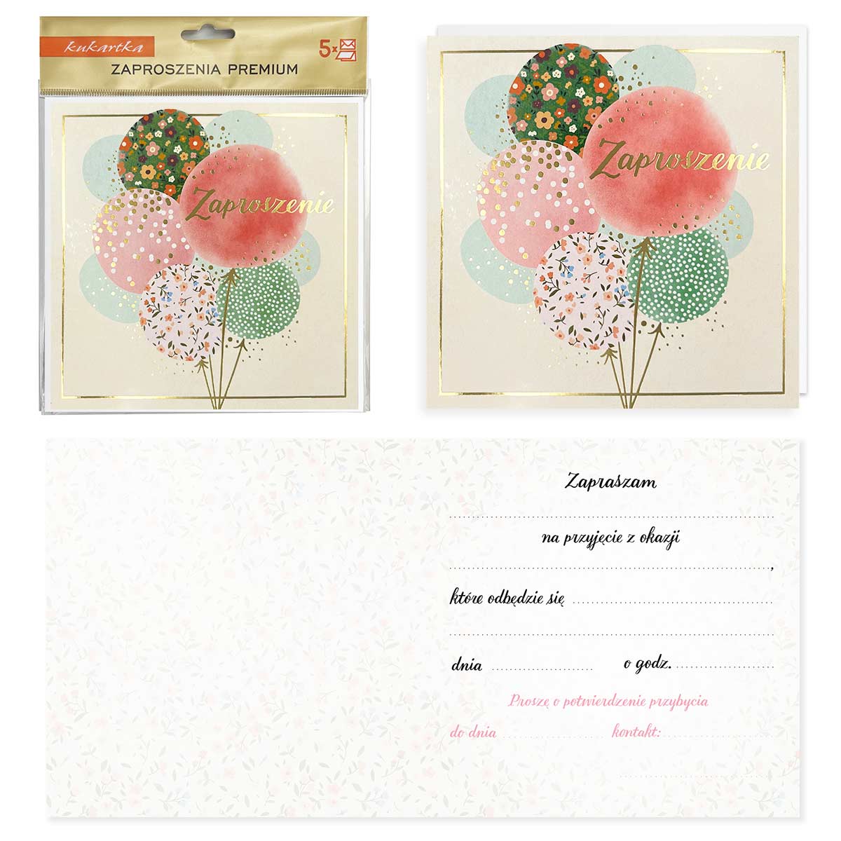 Stylowe i subtelne – to zaproszenie będzie idealnym wstępem do wyjątkowego przyjęcia. Utrzymane w spokojnej, stonowanej kolorystyce, z uroczym nadrukiem balonów, ozdobione złoconym napisem „Zaproszenie” oraz złotą ramką. Całość prezentuje się elegancko i ponadczasowo, pasując do różnych okazji – od urodzin, przez baby shower, aż po chrzciny.