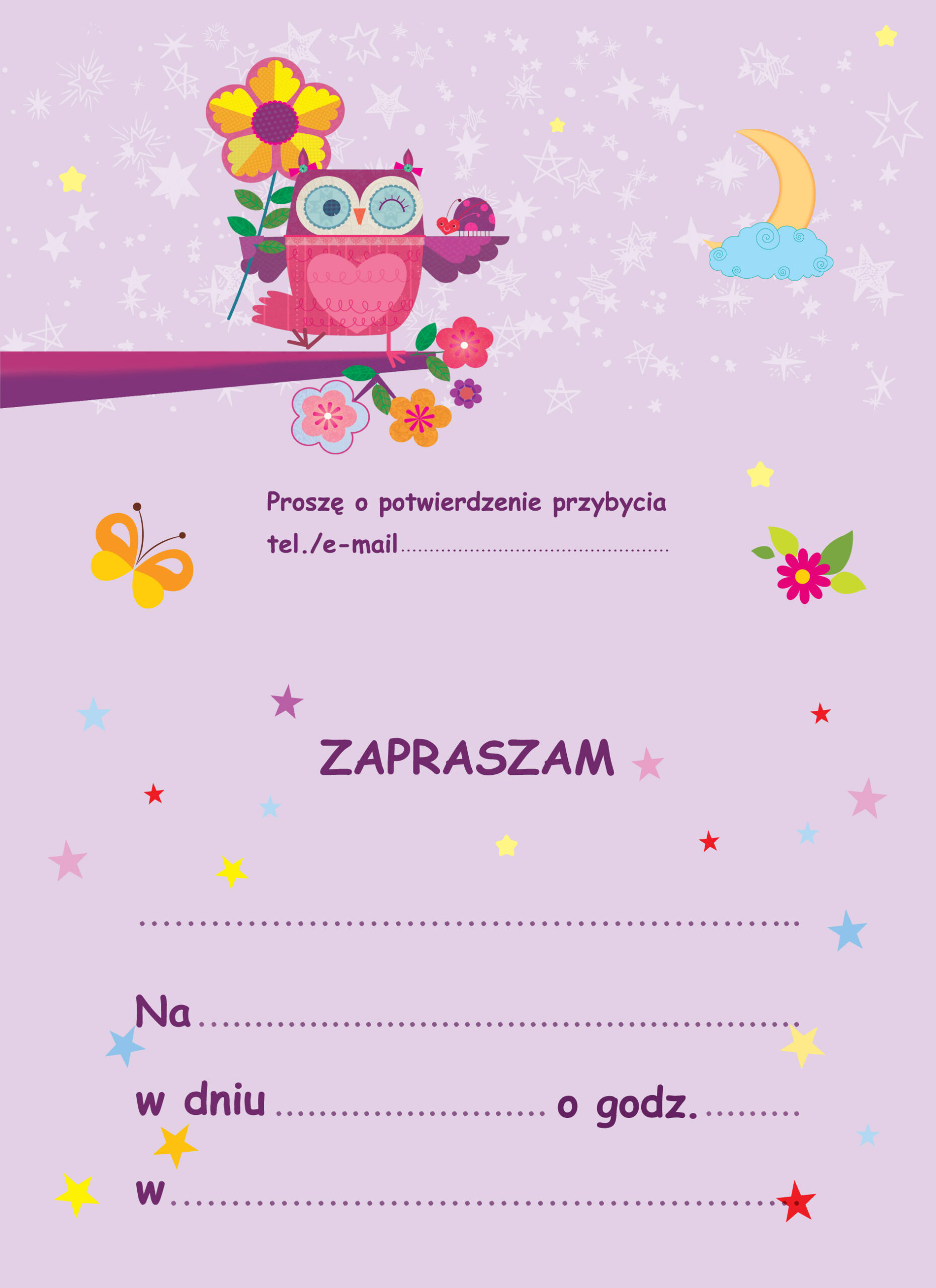 Magiczne zaproszenie na wyjątkowe urodziny! Urocza sówka siedząca na gałęzi z biedronką i kwiatkiem w skrzydełku, otulona nocnym, fioletowym niebem z księżycem,gwiazdkami i chmurką, wprowadzi każdego gościa w bajkowy klimat przyjęcia.