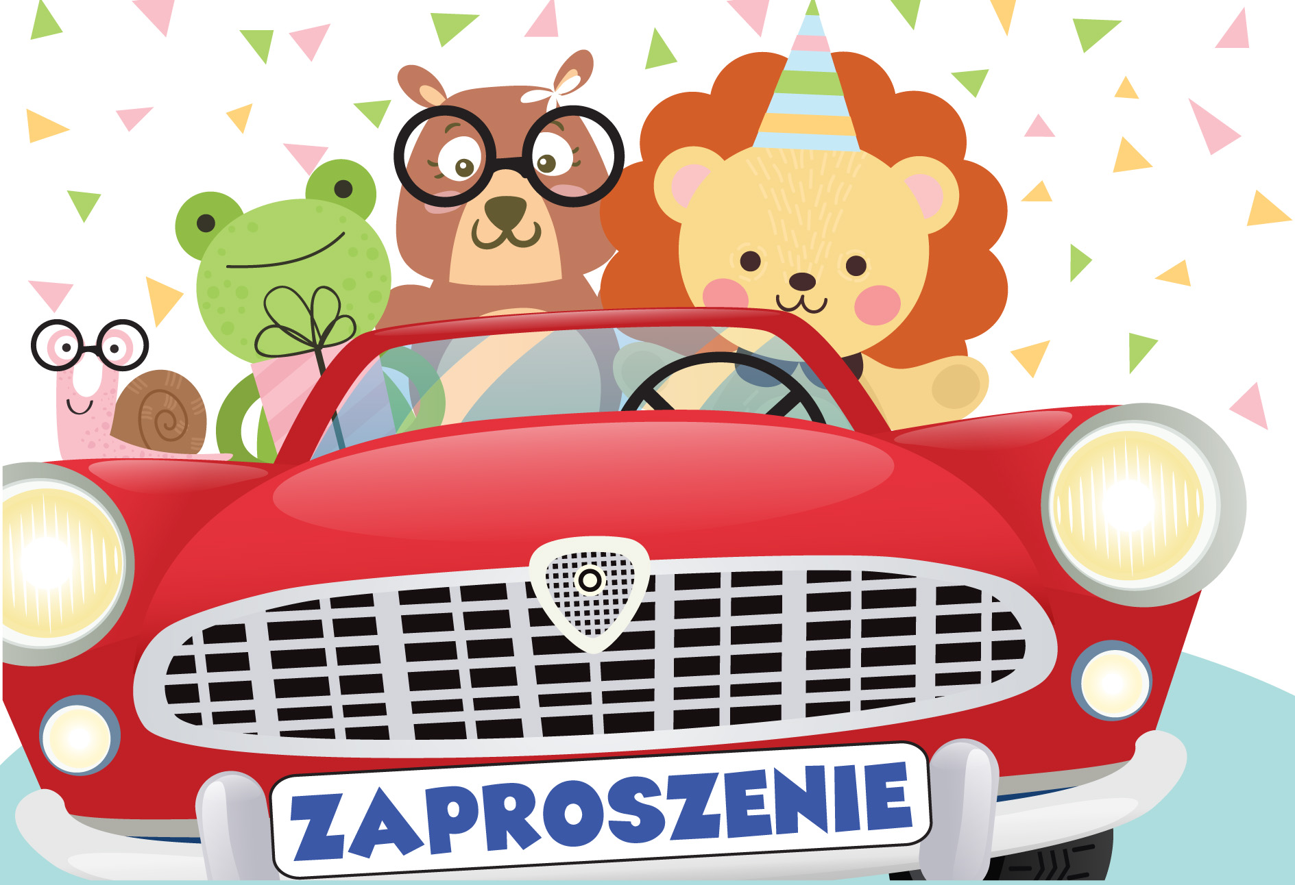 Zaproszenie urodzinowe Zwierzątka w czerwonym samochodzie 5 szt